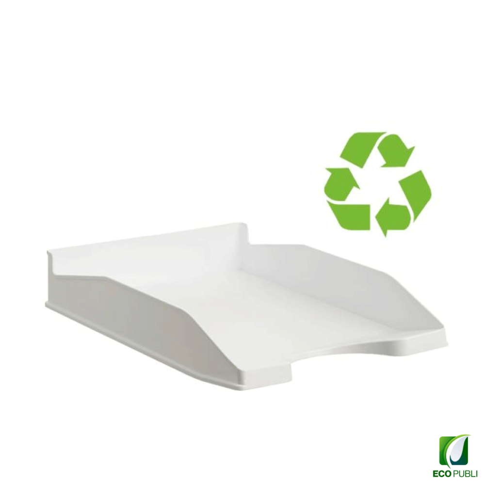 Bandeja de sobremesa sostenible. Fabricado en poliestireno 100% reciclado y reciclable. Válida para formatos A4 y folio. Apilable en 3 posiciones, de forma vertical o escalonadamente. Hendidura frontal para facilitar el acceso a la documentación. Amplia selección de productos sostenibles ideales para la organización del hogar, la configuración de tu oficina en casa o complementar con el resto de accesorios de escritorio. Color blanco pastel. Dimensiones: 345x255x60 mm. Fabricado en España.
