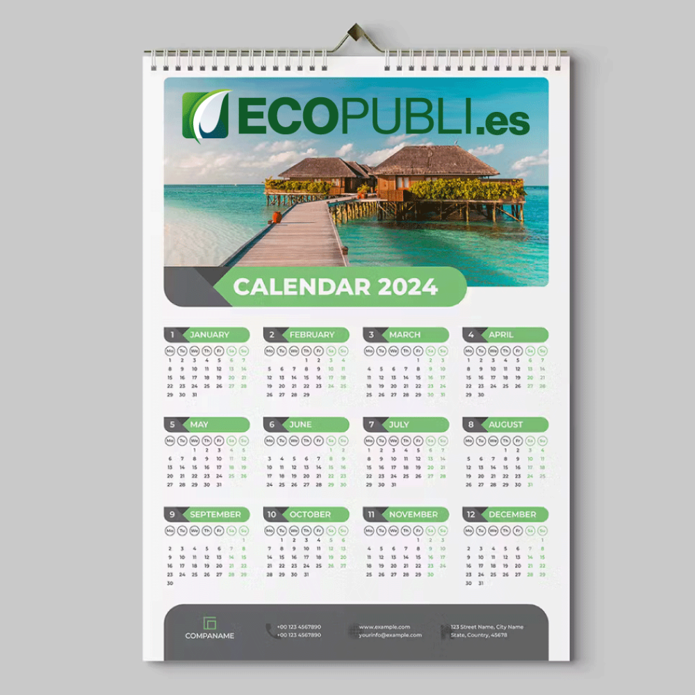 Calendario de Pared A4 14 Hojas y Cuelgafacil. Sostenible PEFC. Si tenemos que elegir un Calendario de Pared con alta calidad y ecológica, seguramente elegiríamos este producto de Ecopubli.