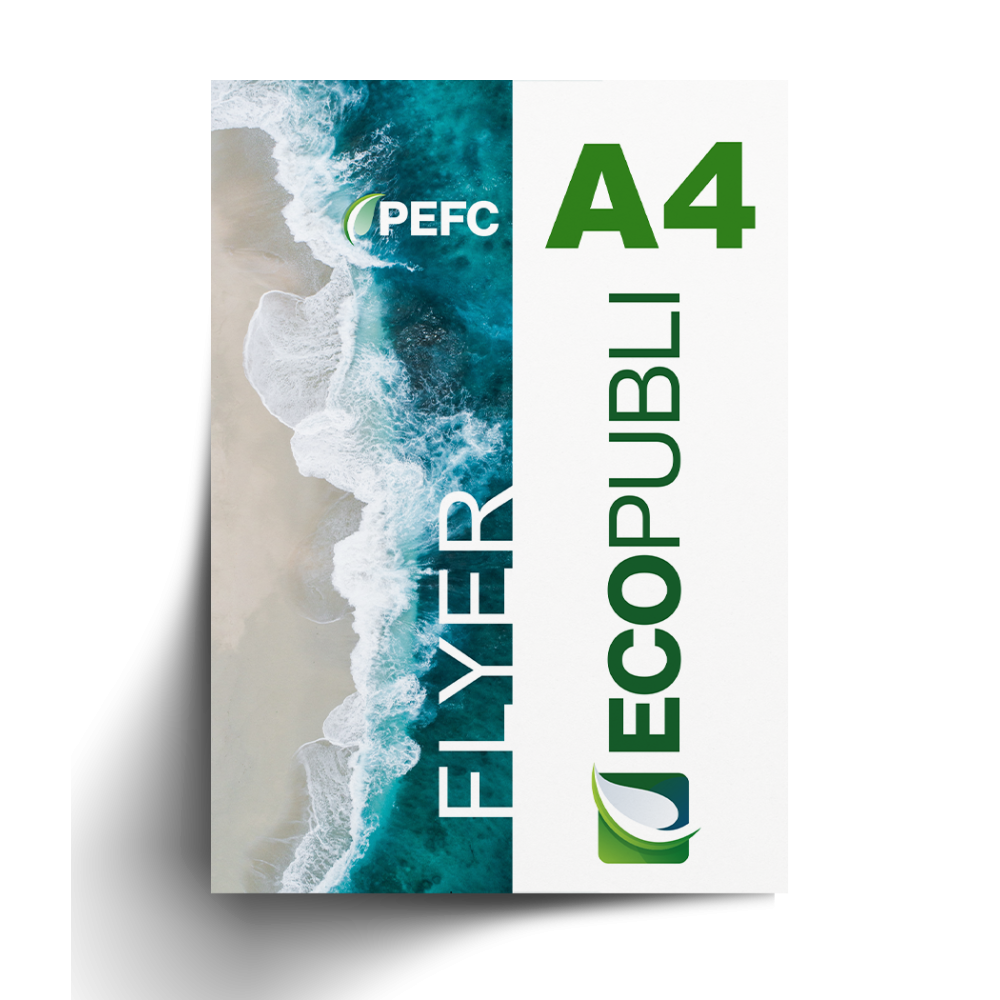 Flyer A4 Sostenible PEFC. Medida 21,0 X 29,7 cm. En Ecopubli disponemos de todo tipo de formatos en Flyers sostenibles con impresión a una o dos caras, con impresión de alta calidad. Cuando ves la etiqueta PEFC en un producto, significa que éste proviene de un bosque con certificación PEFC. Un bosque con certificación PEFC es un bosque que se gestiona de acuerdo a los requisitos ambientales, sociales y económicos más estrictos. Disponemos una amplia gama de formatos para que puedas seleccionar el que más se ajuste, siempre con la garantía de Ecopubli. Para cualquier consulta contactar con nosotros por correo electrónico en tienda@ecopubli.es.