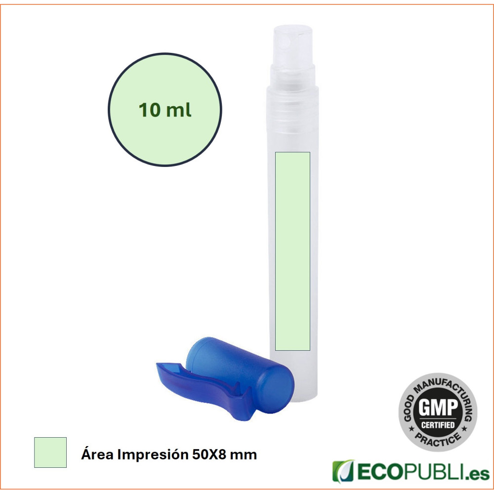 Spray hidroalcohólico para higiene y limpieza de la piel en bote rellenable de 10 ml.