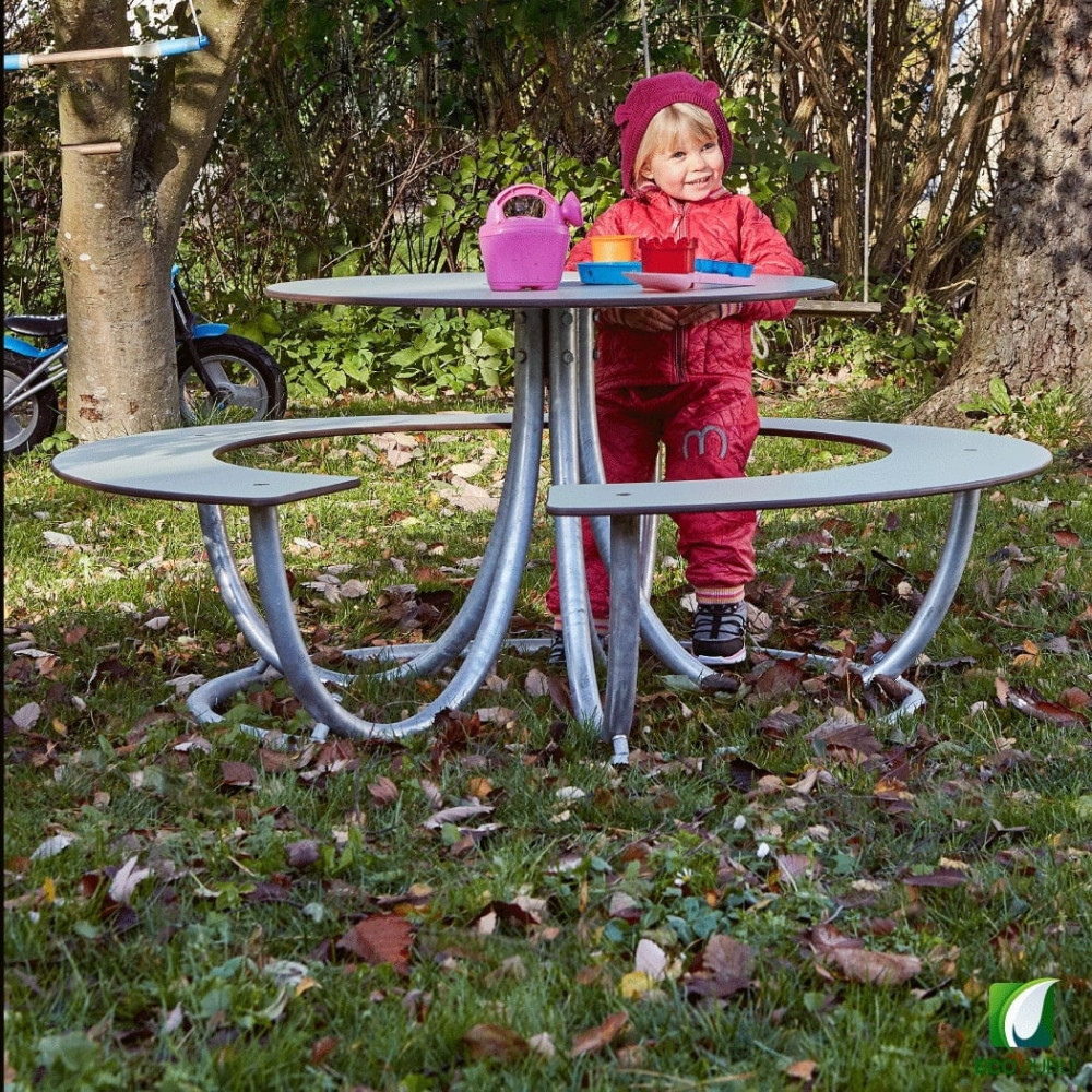 - Squid es una mesa diseñada para su uso en espacios exteriores, jardines de infancia, guarderías o escuelas.