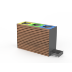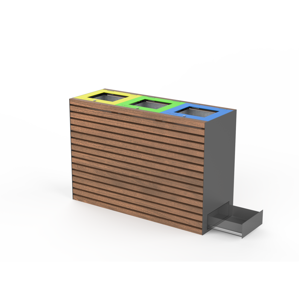 Papelera PSMKCA03302. Papelera de reciclaje en madera y acero. Este modelo tiene tres inserciones de acero galvanizado con una capacidad de 70 litros cada una, una cerradura del sistema y un cajón funcional para consumibles (bolsas de basura, agentes de limpieza). Es un verdadero camaleón entre el mobiliario urbano gracias a su diseño minimalista y variados acabados y materiales. Esta colección es uno de los más vendidos en nuestra oferta. Ver acabados en Ficha Técnica en el apartado de adjuntos.Para cualquier consulta contactar con nosotros por correo electrónico en tienda@ecopubli.es