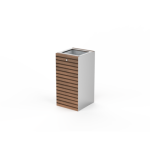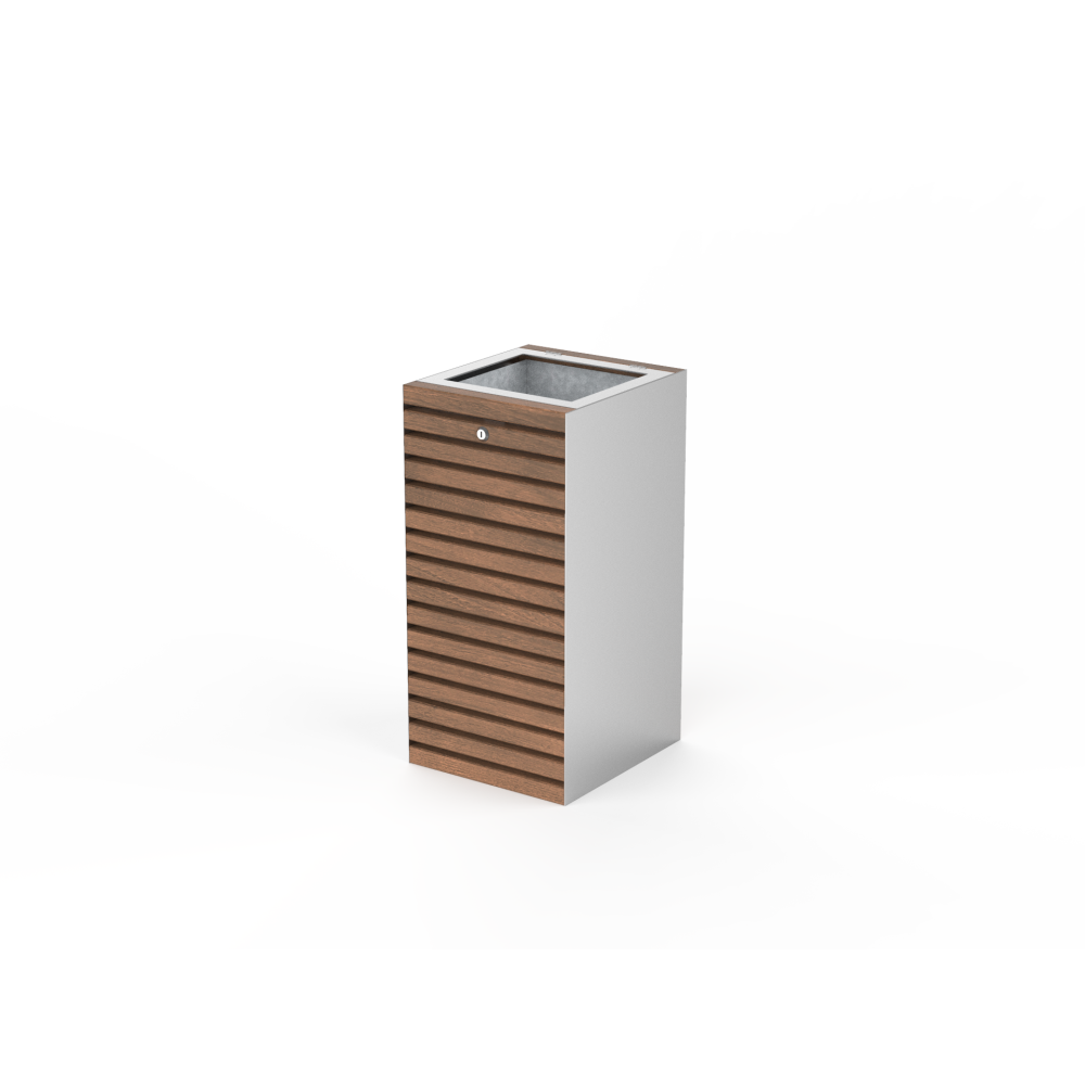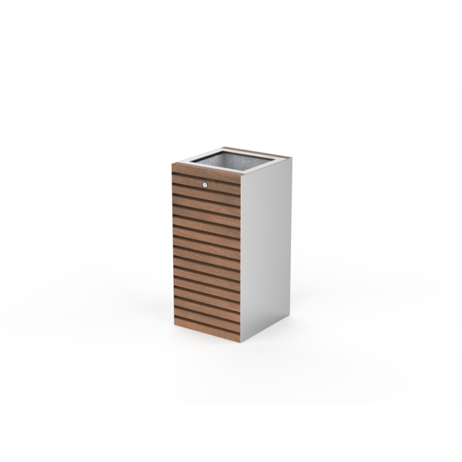 Papelera PSMKCA04600. Papelera cuadrada de madera y acero. Este modelo tiene un inserto de acero galvanizado con una capacidad de 75 litros y una cerradura del sistema Es un verdadero camaleón entre el mobiliario urbano gracias a su diseño minimalista y variados acabados y materiales. Esta colección es uno de los más vendidos en nuestra oferta. Ver acabados en Ficha Técnica en el apartado de adjuntos.Para cualquier consulta contactar con nosotros por correo electrónico en tienda@ecopubli.es