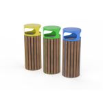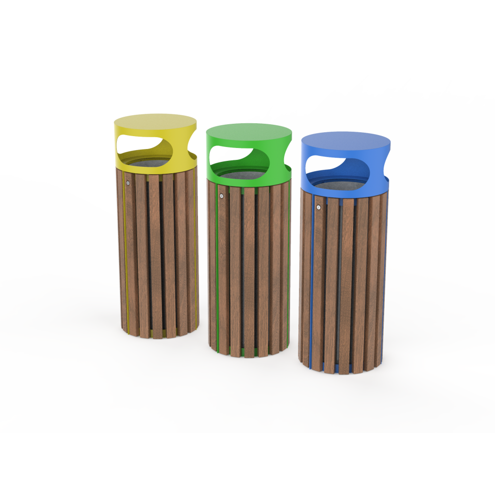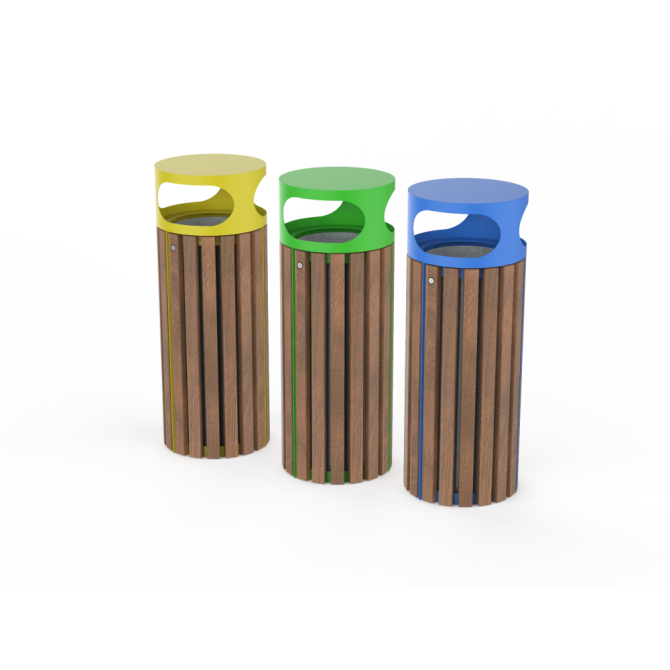 Papelera PSMKWA00501. Conjunto de papeleras cilíndricas de reciclaje de madera y acero. Tienen techos de colores, inserciones de acero galvanizado con una capacidad de 35 litros cada una y cerraduras del sistema. Es perfecta para proyectos de parques y lugares de descanso. Las formas ergonómicas son una invitación a utilizar y dar un toque de prestigio. Ver acabados en Ficha Técnica en el apartado de adjuntos.Para cualquier consulta contactar con nosotros por correo electrónico en tienda@ecopubli.es