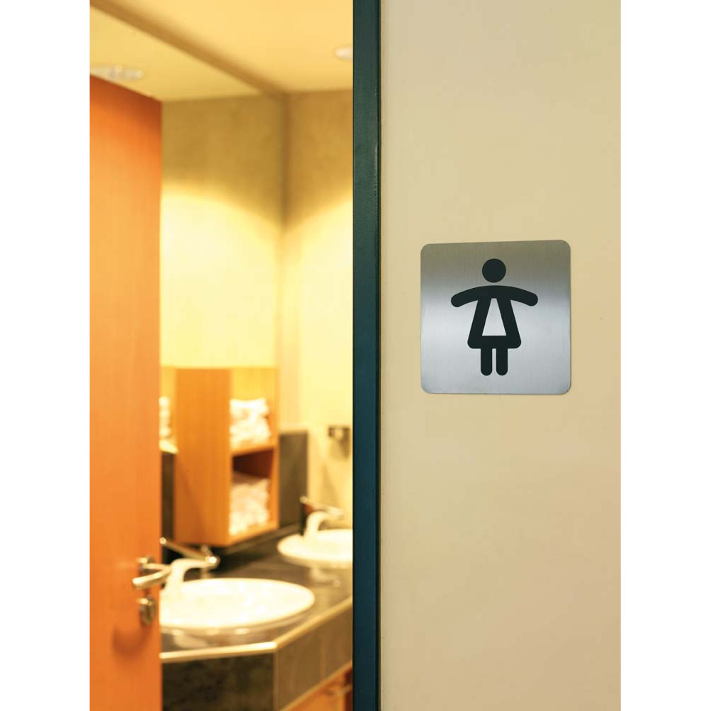 - Símbolos de Acero Inoxidable pulido de alta calidad con Forma Cuadrangular. Fijación mediante bandas Autoadhesivas. Motivo: WC Mujeres. Medidas: 150 x 150 mm.