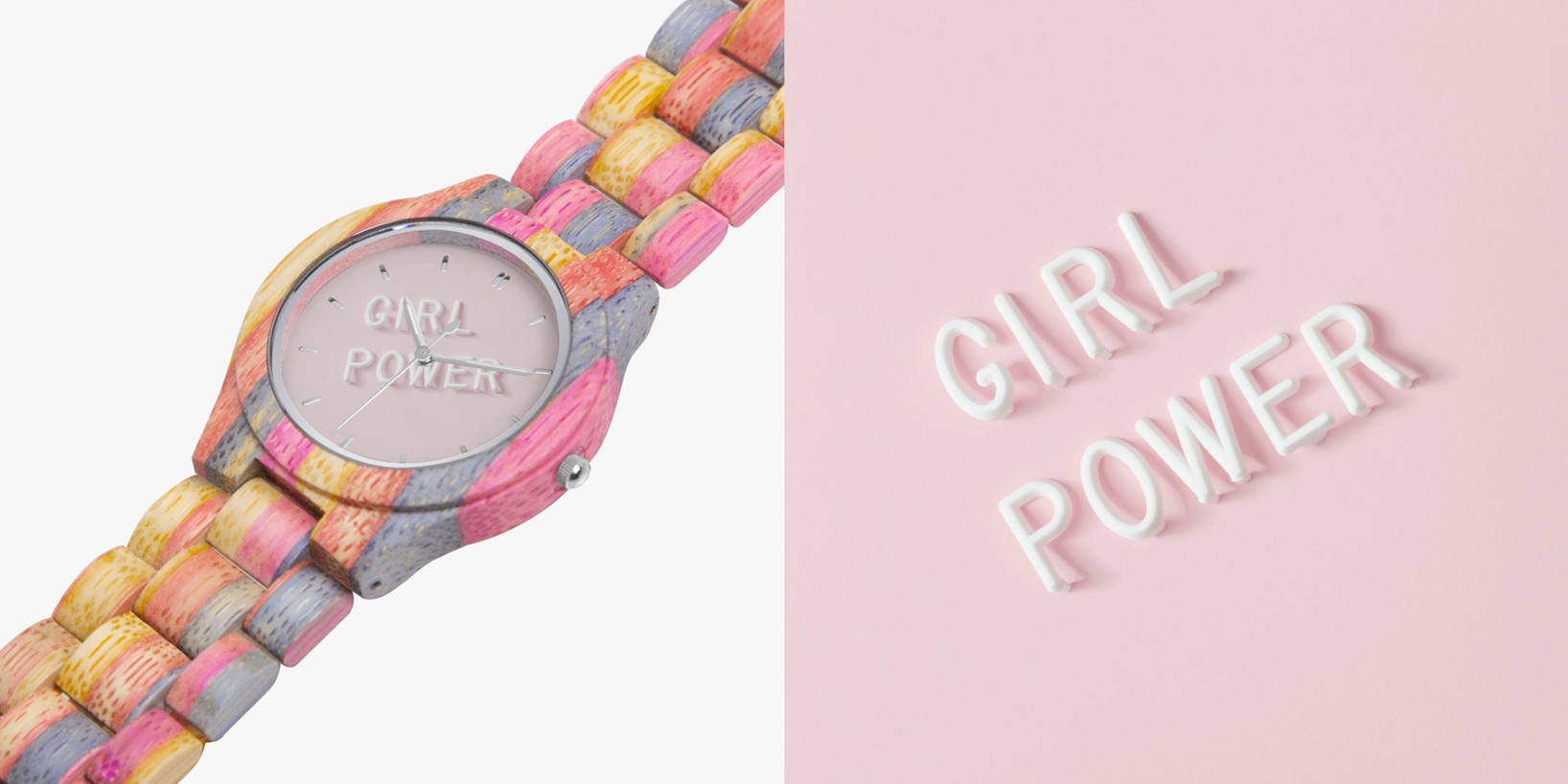 Este reloj de madera con camuflaje gris y rosa combina un color intenso con la textura natural de la madera.
