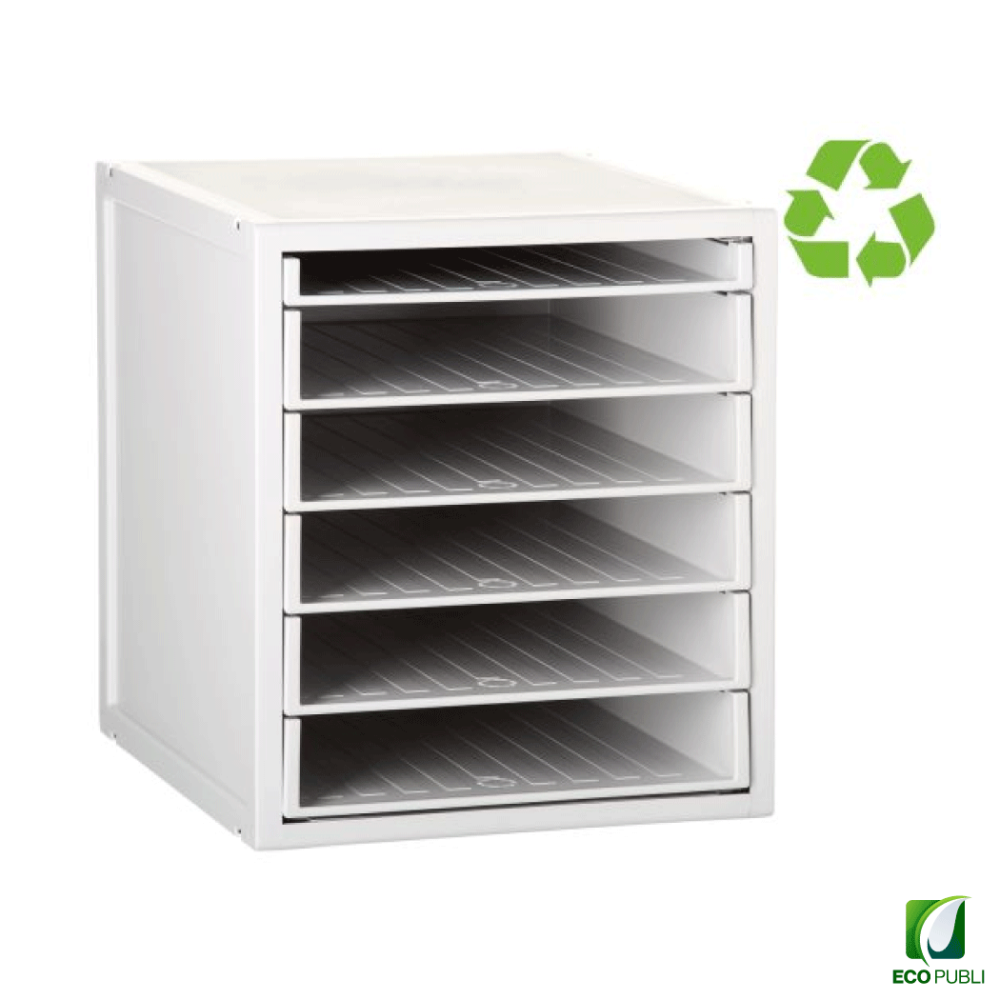 - Sistema de organización modular sostenible con 6 bandejas, 1 bandeja de 22 mm, y 5 bandejas de 52 mm.