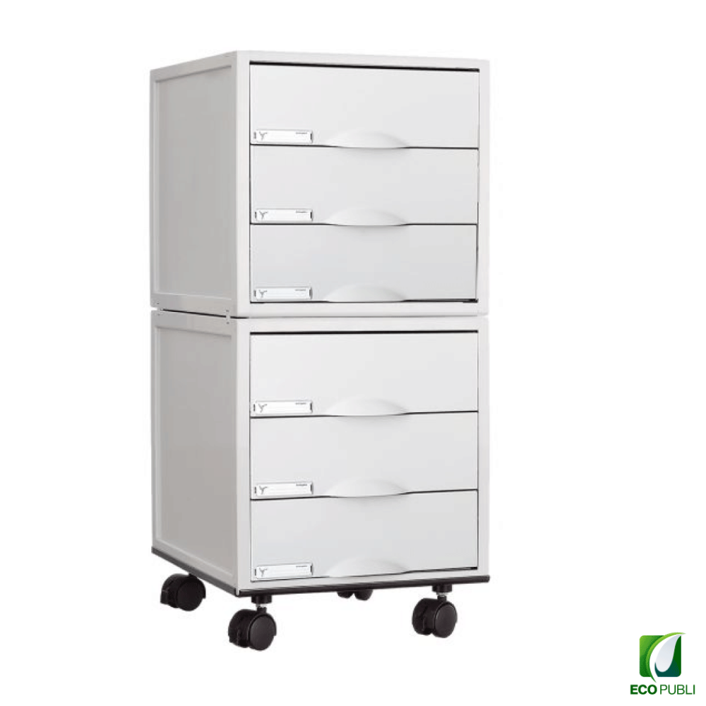 - Sistema de organización modular sostenible formado por dos módulos unidos de 3 cajones y base metálica con ruedas y frenos para facilitar su desplazamiento.